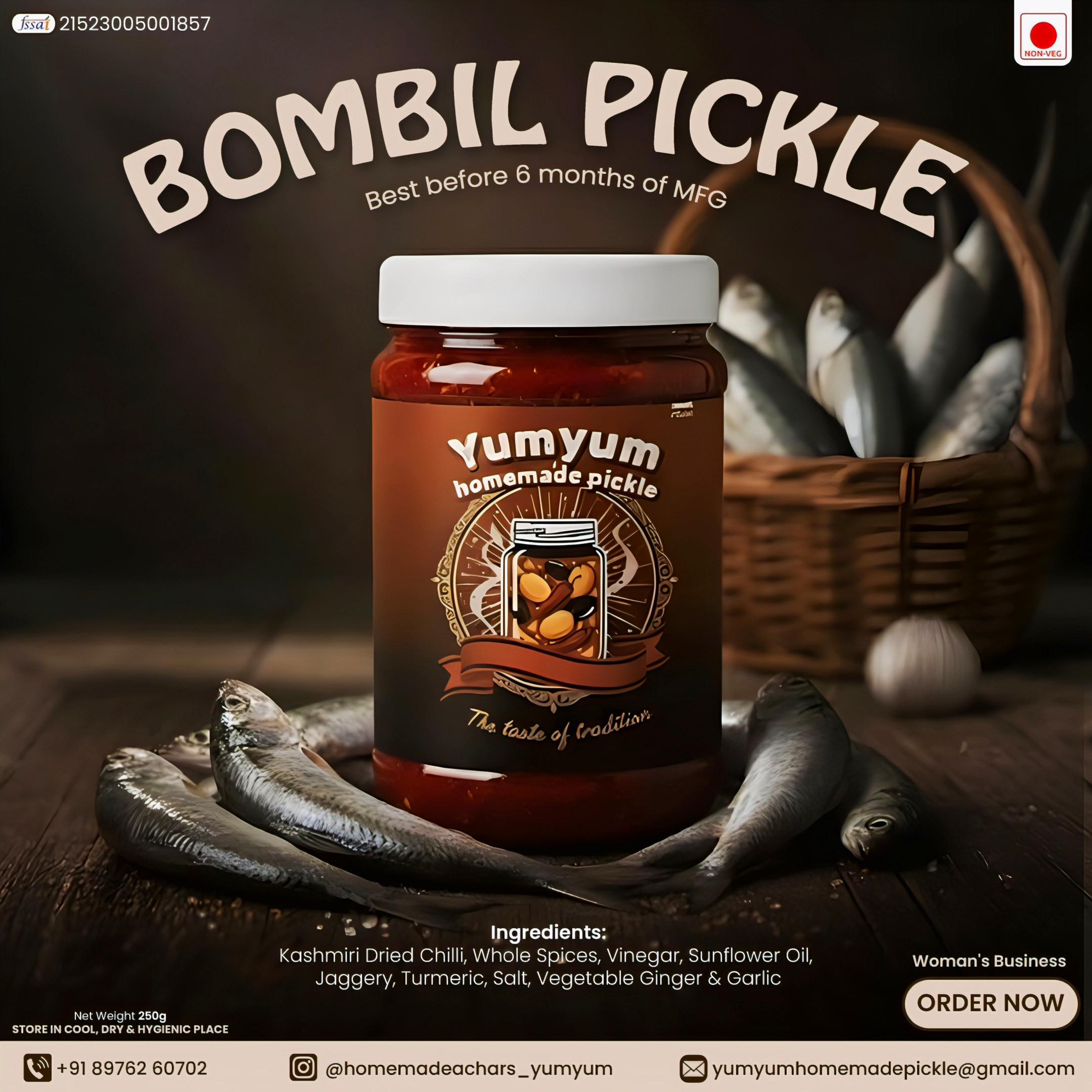 Enjoy the rich, coastal flavor of YumYum Homemade Bombayduck (Bombil) Pickle, a specialty crafted from dried Bombay duck fish, expertly spiced and preserved in oil and vinegar for authentic taste. This pickle blends juicy, fried bombil pieces with a robust masala of Kashmiri chillies, garlic, ginger, turmeric, and signature whole spices, bringing a spicy and tangy punch to every bite. Prepared in small batches, our Bombayduck pickle offers a delicious burst of tradition and makes a perfect accompaniment to rice, bread, or any meal. Elevate your dining experience with the unique and mouthwatering essence of this coastal delicacy